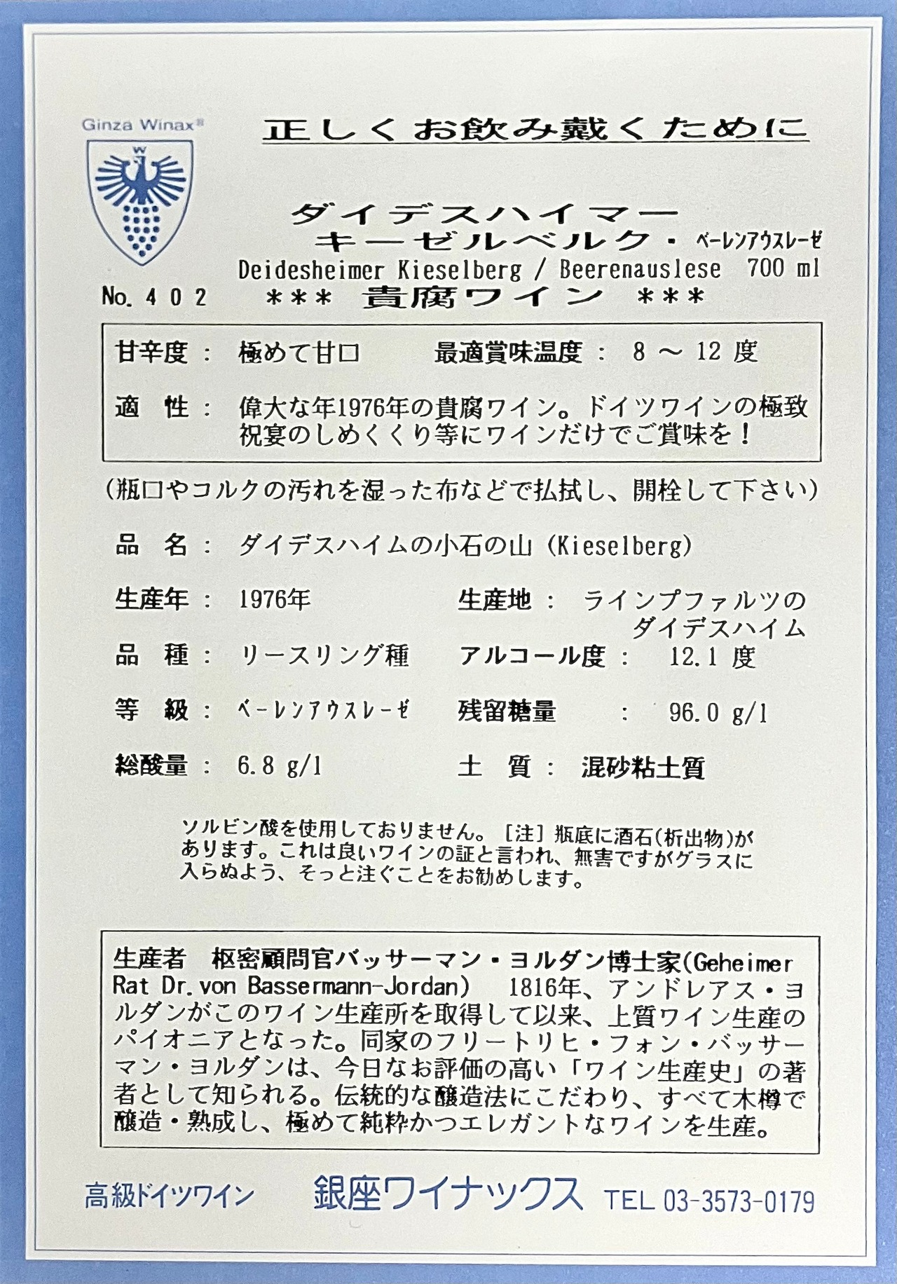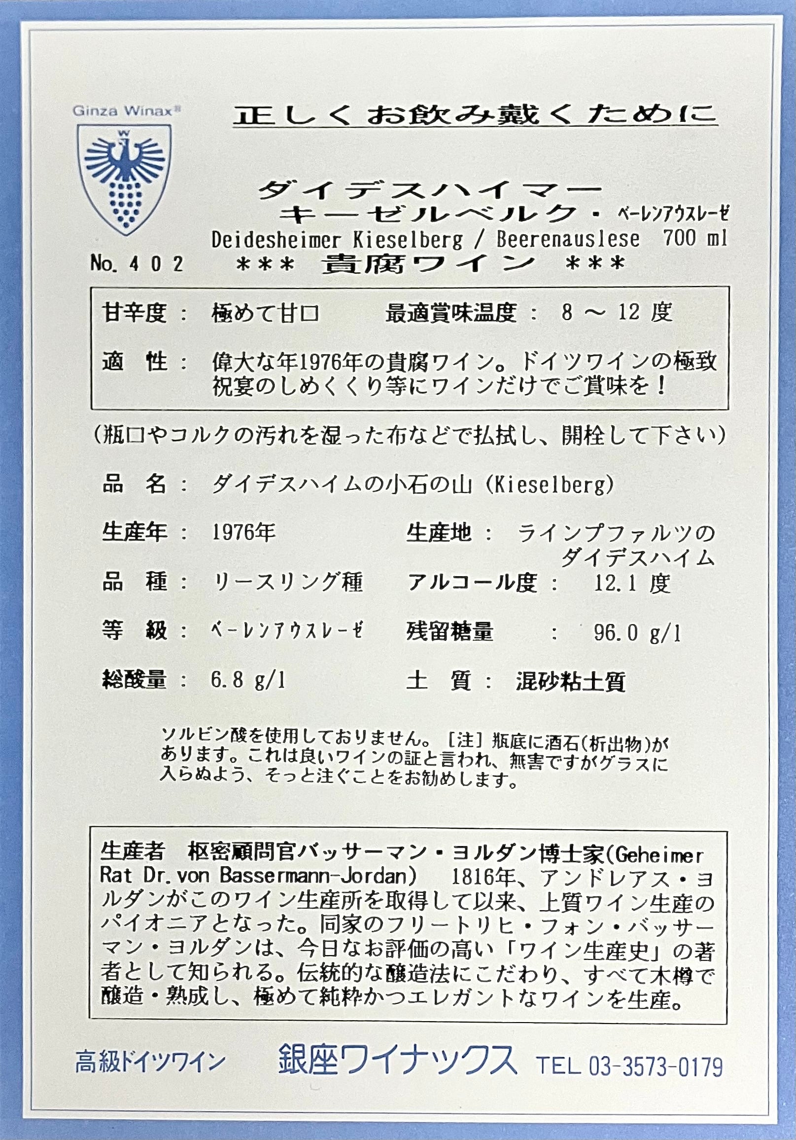 No.402〈1976年産 熟成甘口リースリング〉ダイデスハイマー キーゼルベルク リースリング ベーレンアウスレーゼ1976